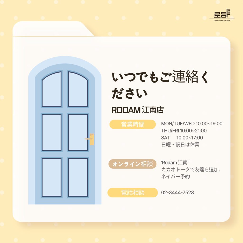 ロダム韓医院 江南店は、いつでも皆さんからのご連絡をお待ちしております。