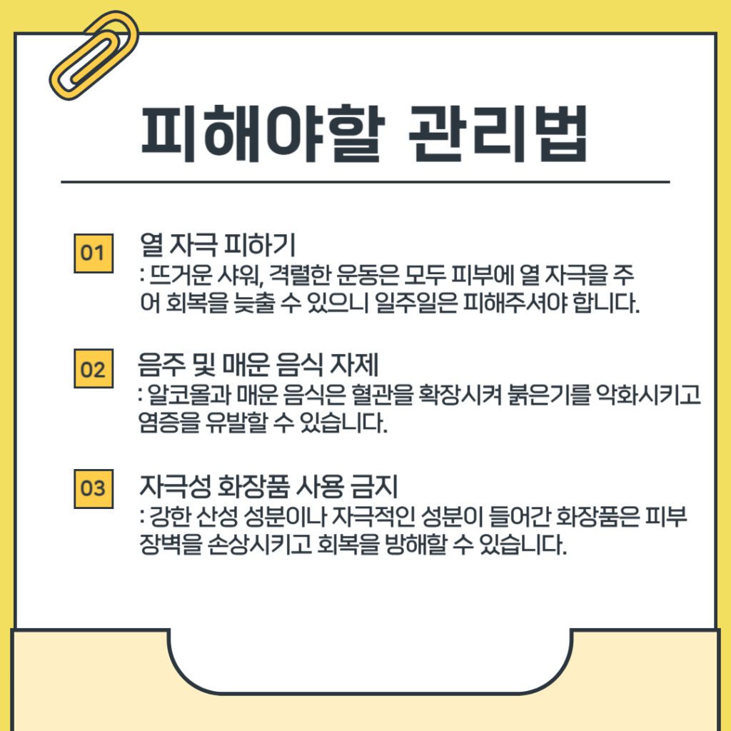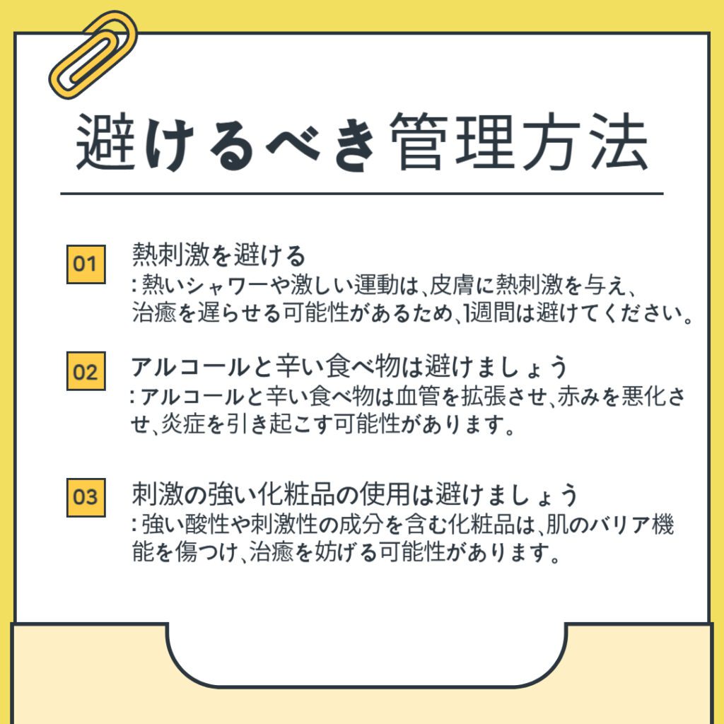 - 飲酒および辛い食べ物を控える: アルコールや辛い食べ物は血管を拡張させ赤みを悪化させ、炎症を引き起こす可能性があります。施術後は肌が敏感になっているため、しばらく控えることが望ましいです。