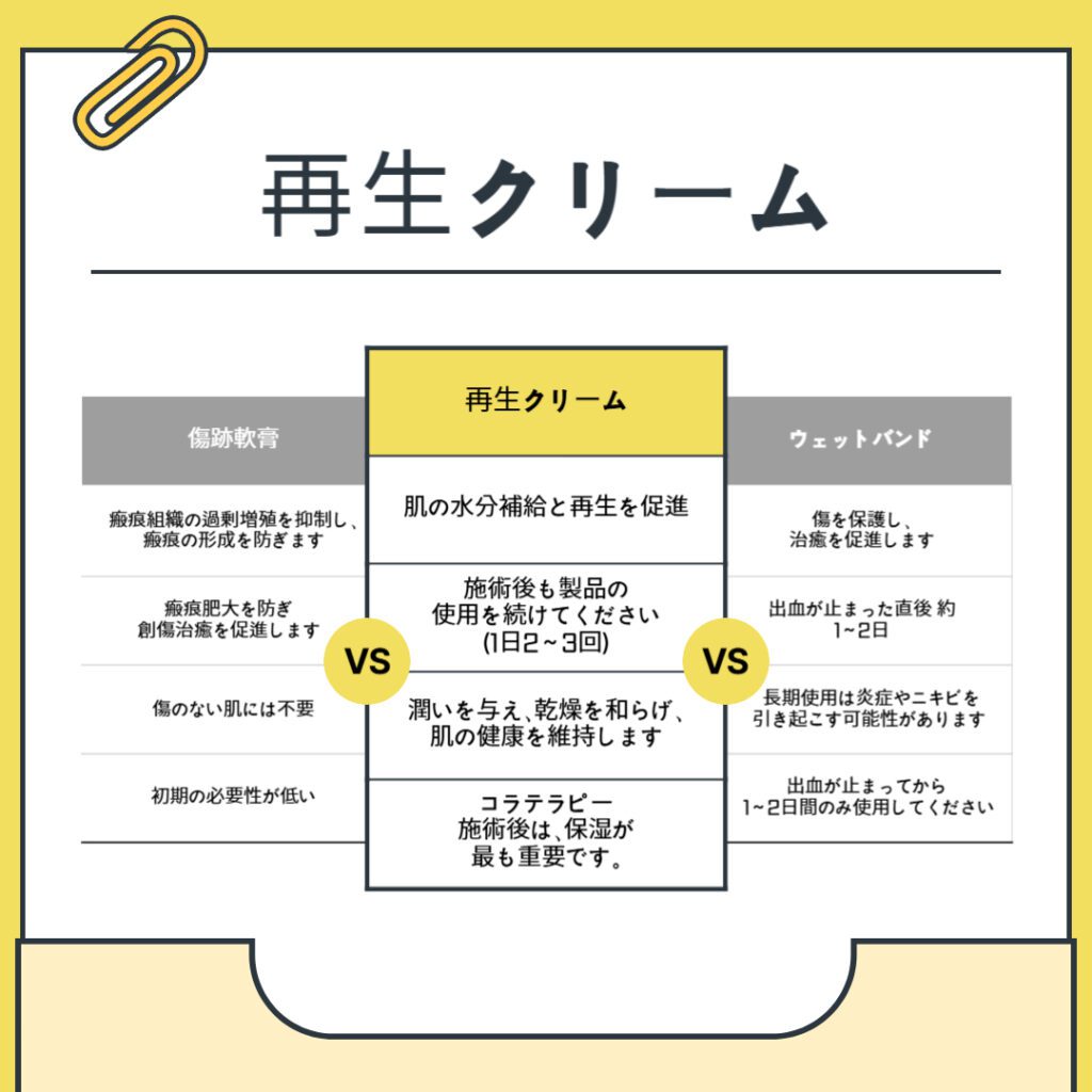 傷跡用軟膏や湿潤バンドより再生クリームを使用することが最も適したケア方法と言えます。