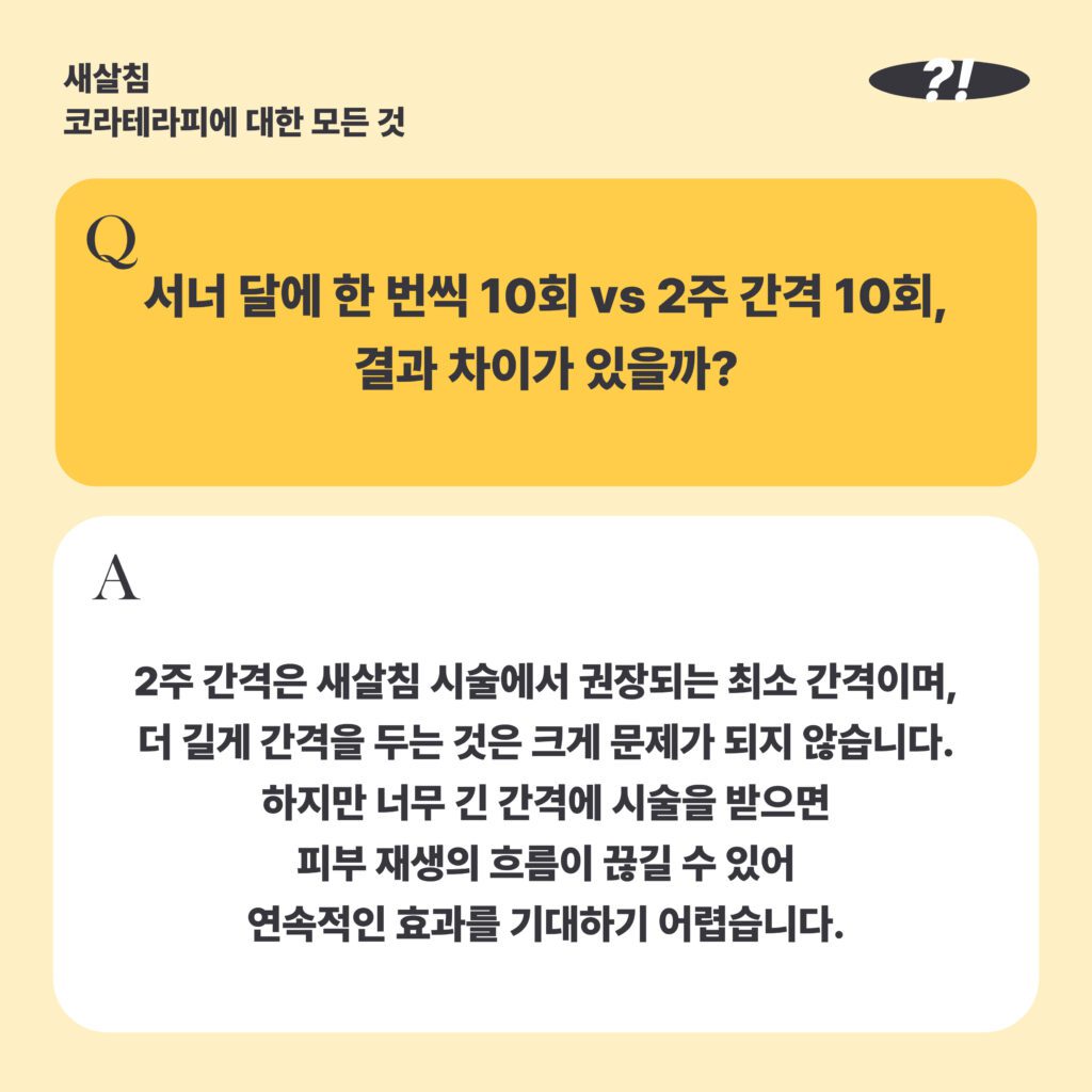 결론부터 말씀드리면, 2주 간격은 새살침 시술에서 권장되는 최소 간격이며,