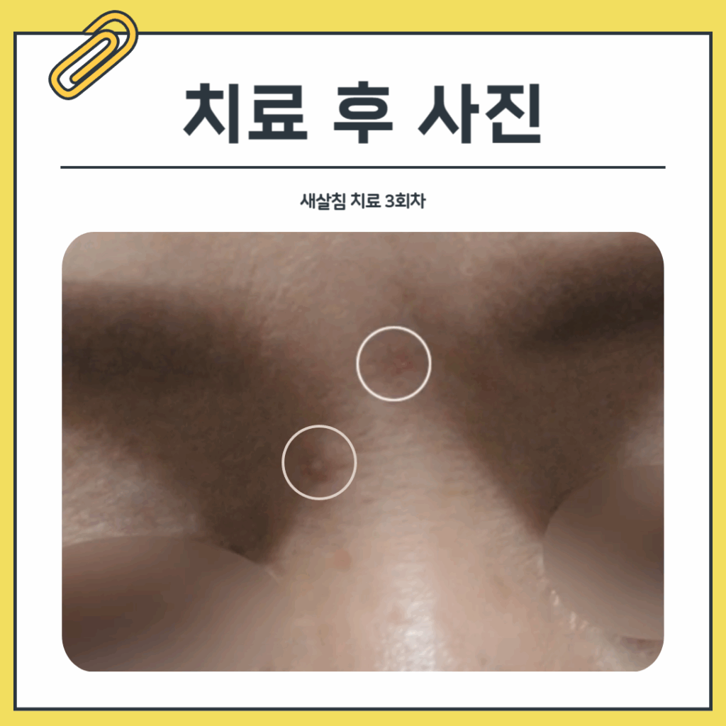 미간 가운데의 흉터는 전체적으로 균일하게 새살이 차오른 것을 볼 수 있고