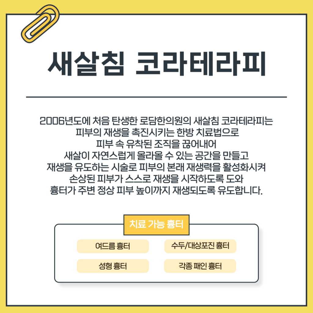 안녕하세요, 흉터 지우는 새살침의 시작 로담한의원입니다.