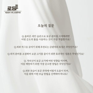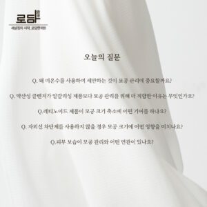 Read MoreQ.왜 미온수를 사용하여 세안하는 것이 모공 관리에 중요할까요? A.미온수를 사용하여 세안하면 피부에 불필요한 자극을 줄이고 피부 장벽을 보호할 수 있어 모공 관리에 도움이 됩니다. 너무 뜨거운 물은 피부의 천연 유분을 제거해 건조를 유발하고, 반대로 찬물은 모공 세정력을 떨어뜨릴 수 있습니다. 미온수(약 30~35도)는 모공을 부드럽게 열어 노폐물 제거가 용이하게 하며...