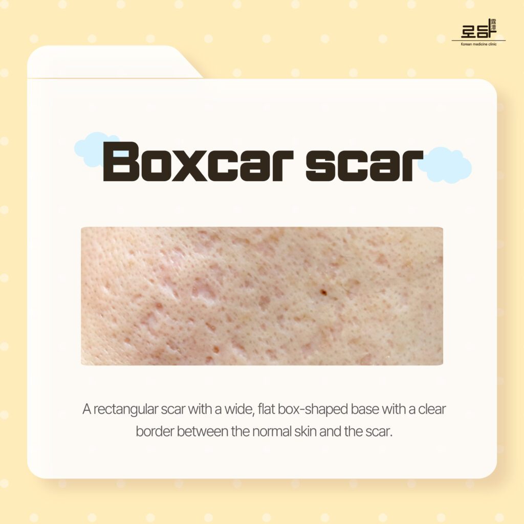Boxcar scars are characterized by distinct and sunken edges, resembling a boxcar.