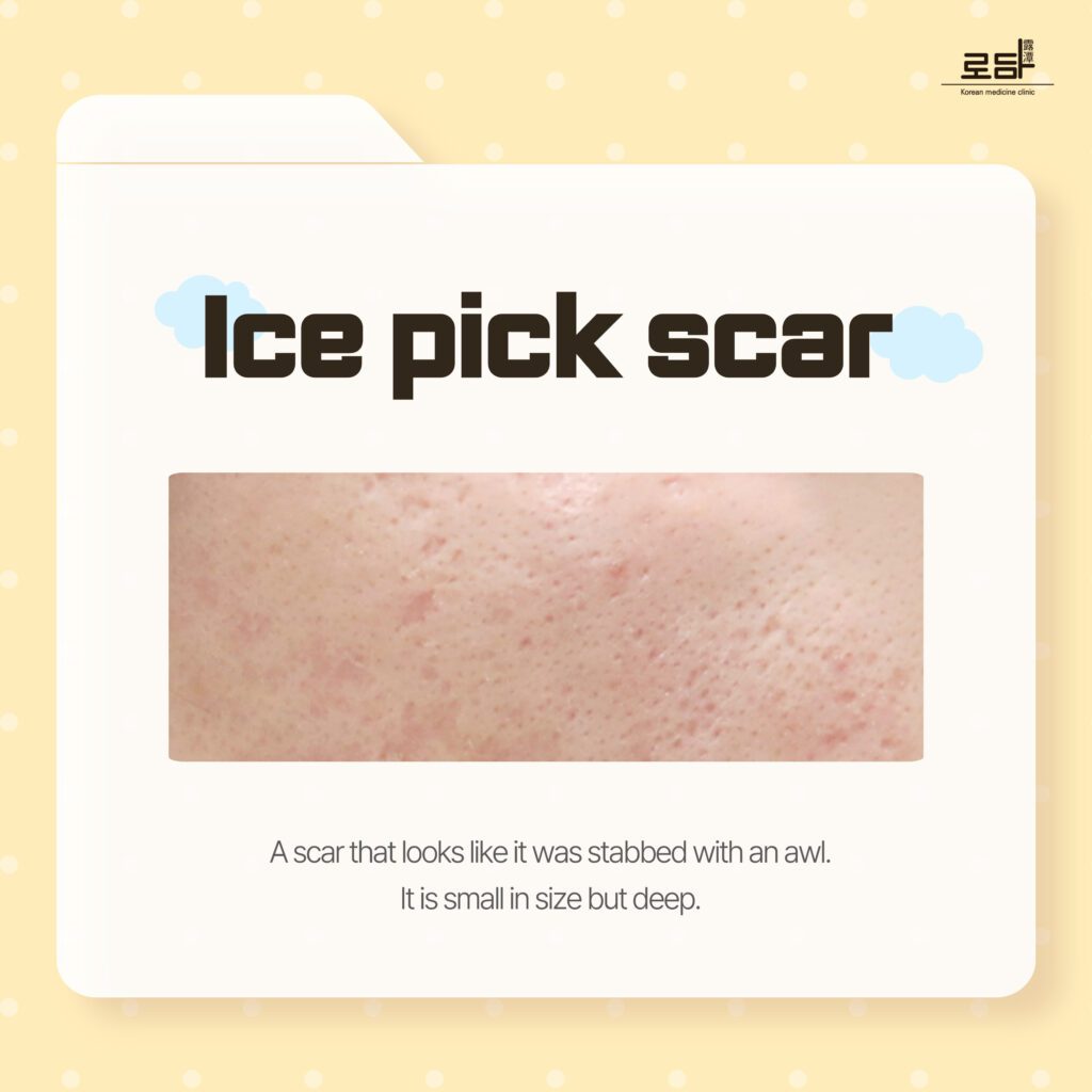 Ice pick scars are small, deep indentations that resemble marks made by an ice pick.