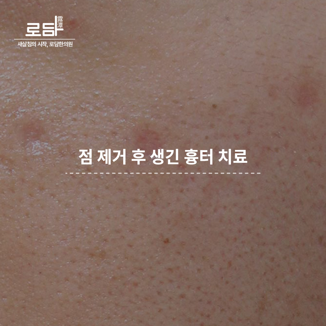 안녕하세요, 흉터 지우는 새살침의 시작 로담한의원입니다.점 제거 시술은 이제 많은 사람들이 부담 없이 선택하는 대중적인 시술이 되었습니다.하지만 점을 뺀 후 남을 수 있는 패인흉터에 대해서는 잘 알지 못하는 경우가 많습니다.특히 얼굴에 있는 점은 한두 개만 제거하는 것이 아니라전체적으로 여러 개를 동시에 제거하는 경우가 많아,그만큼 패인흉터도 넓은 부위에 생길 수 있습니다...